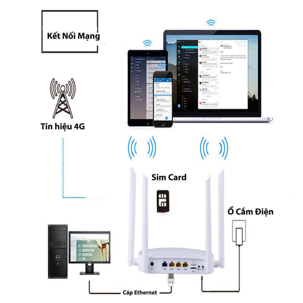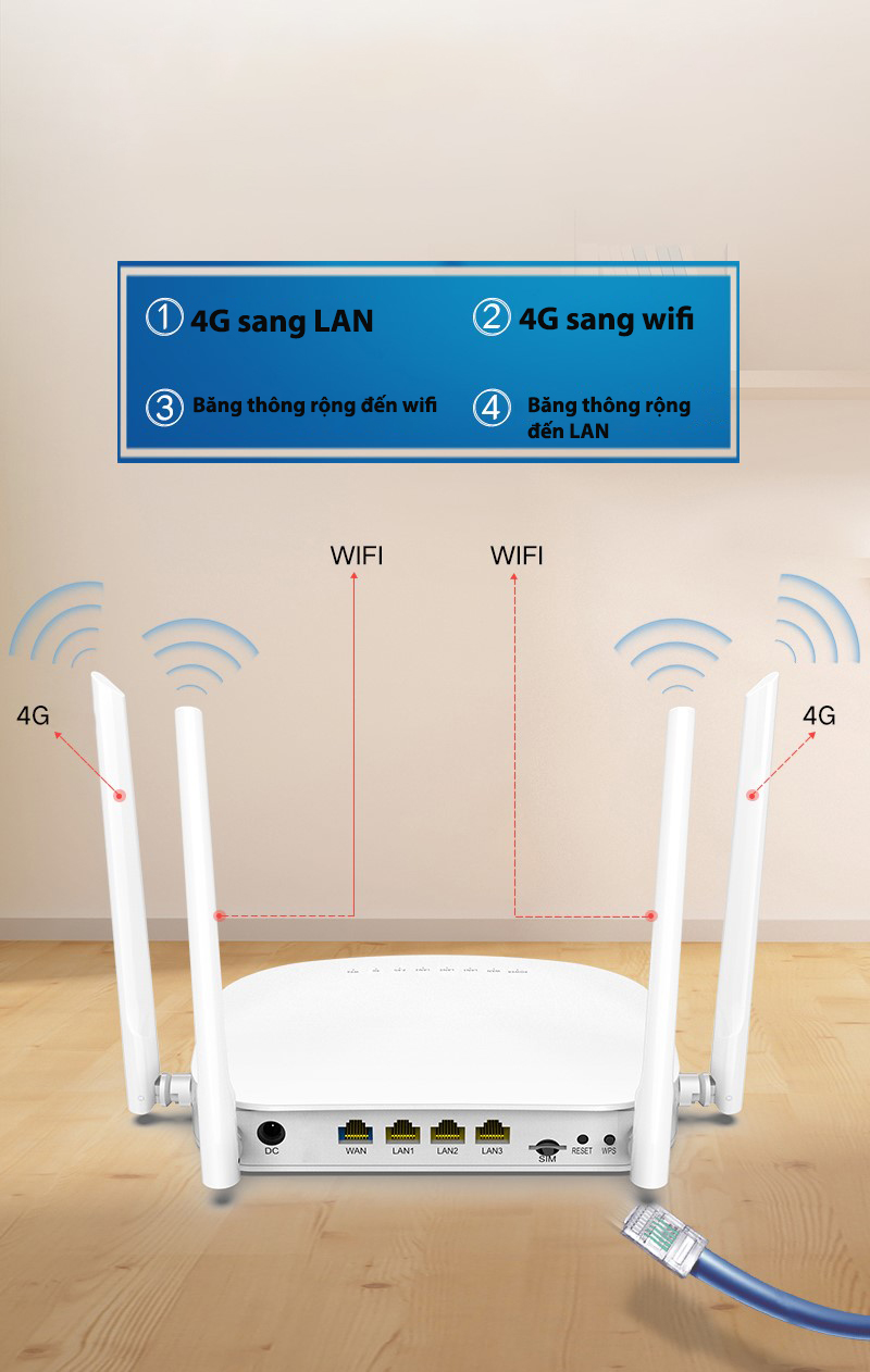 Thiết bị hỗ trợ 4 cổng LAN (3 cổng LAN + 1 Cồng Wan), 1 khe sim…