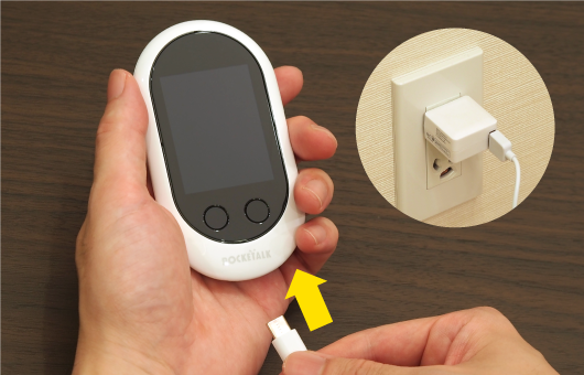 Pocketalk được vận chuyển tại nhà máy. Khi mức pin thấp hoặc thấp, hãy kết nối cáp USB đi kèm với bộ chuyển đổi điện thoại thông minh hoặc PC để sạc pin. (Không bao gồm bộ chuyển đổi)